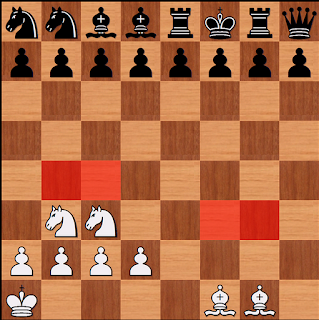 The squares in red are blind to the military knights directly in front of them in two adjacent squares, and for the powerful patriarch bishop pair, the blindspot is displaced by one rank. Finally there is a feature that the very different minor pieces have in common and only Chess960 really shows it!